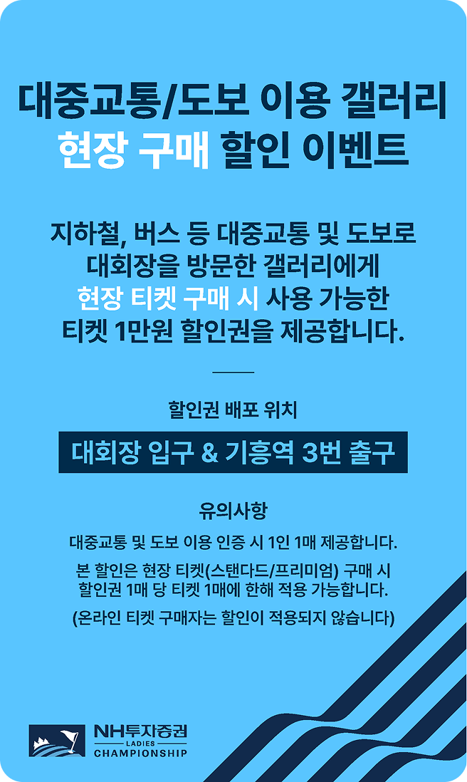 본 대회 입장객은 경기 중 발생할 수 있는 타구 사고 등 모든 사고에 대한 위험을 인지하고 주의해야 합니다. (본인 부주의로 인한 사고 발생 시 대회 주최사, KLPGA, 수원CC 등은 관련 책임을 지지 않습니다.) |